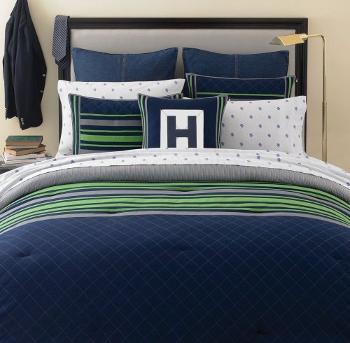 a hundred percent Cotton.9 ounce polyester filled.Twin set features 1 Twin Comforter and 1 Standard Sham.features distinction quilting.Cotton Twill comforter. Tommy Hilfiger Rugby Navy Collection features horizontal rugby stripe in one hundred percent cotton twill in gray and green on navy ground together with contrast quilting and mitered flange accompanying twill stripe back..